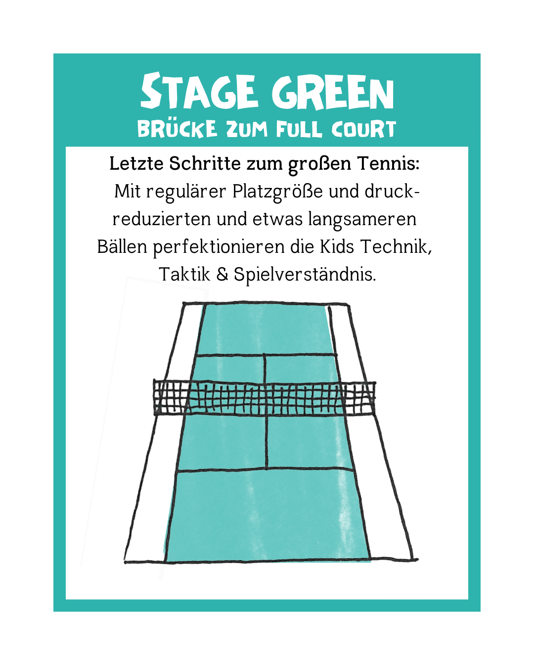 - Green Stage (9-12 years): Transition to full-court tennis