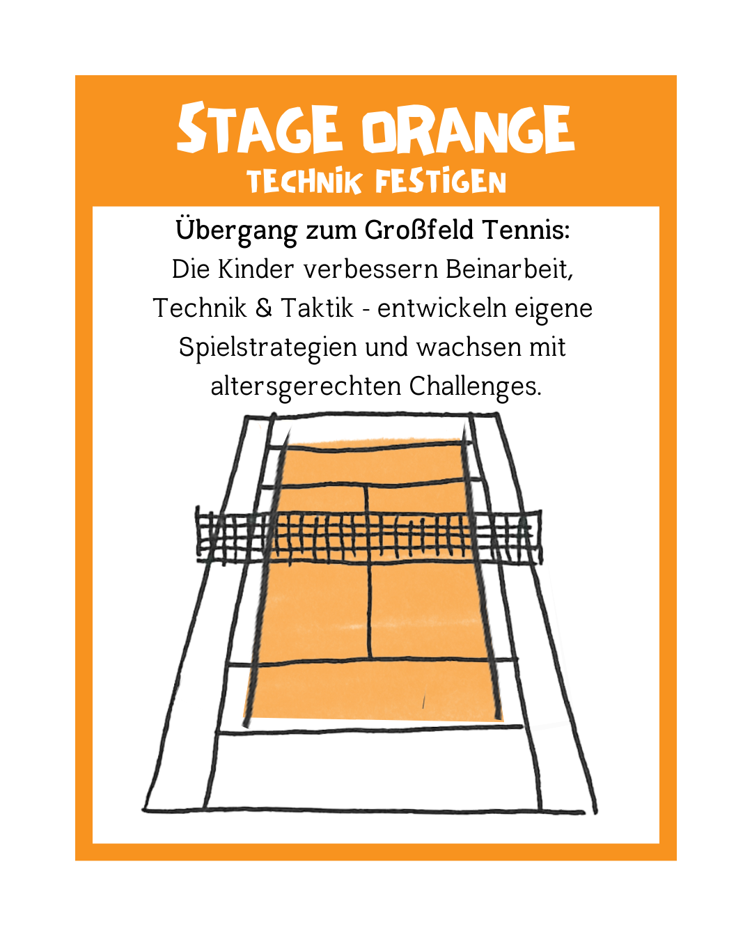 - Orange Stage (7-10 years): Consolidating technique in the midcourt