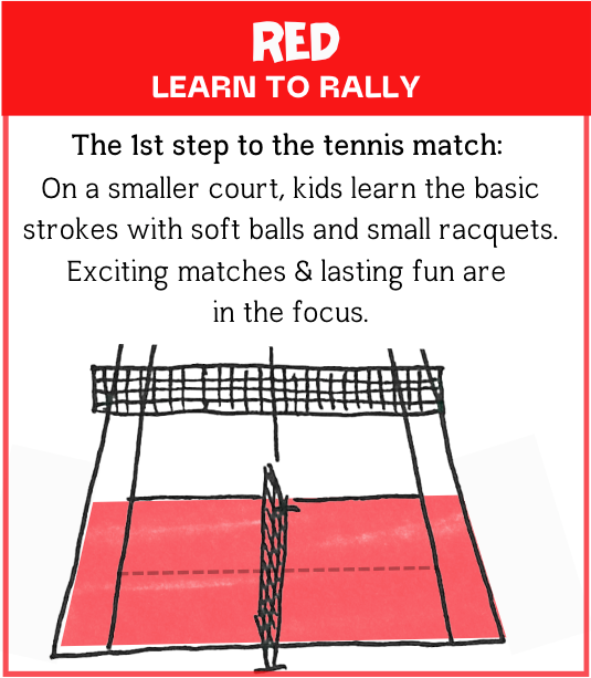 - Red Stage (5-8 years): First rallies on a small field using training balls