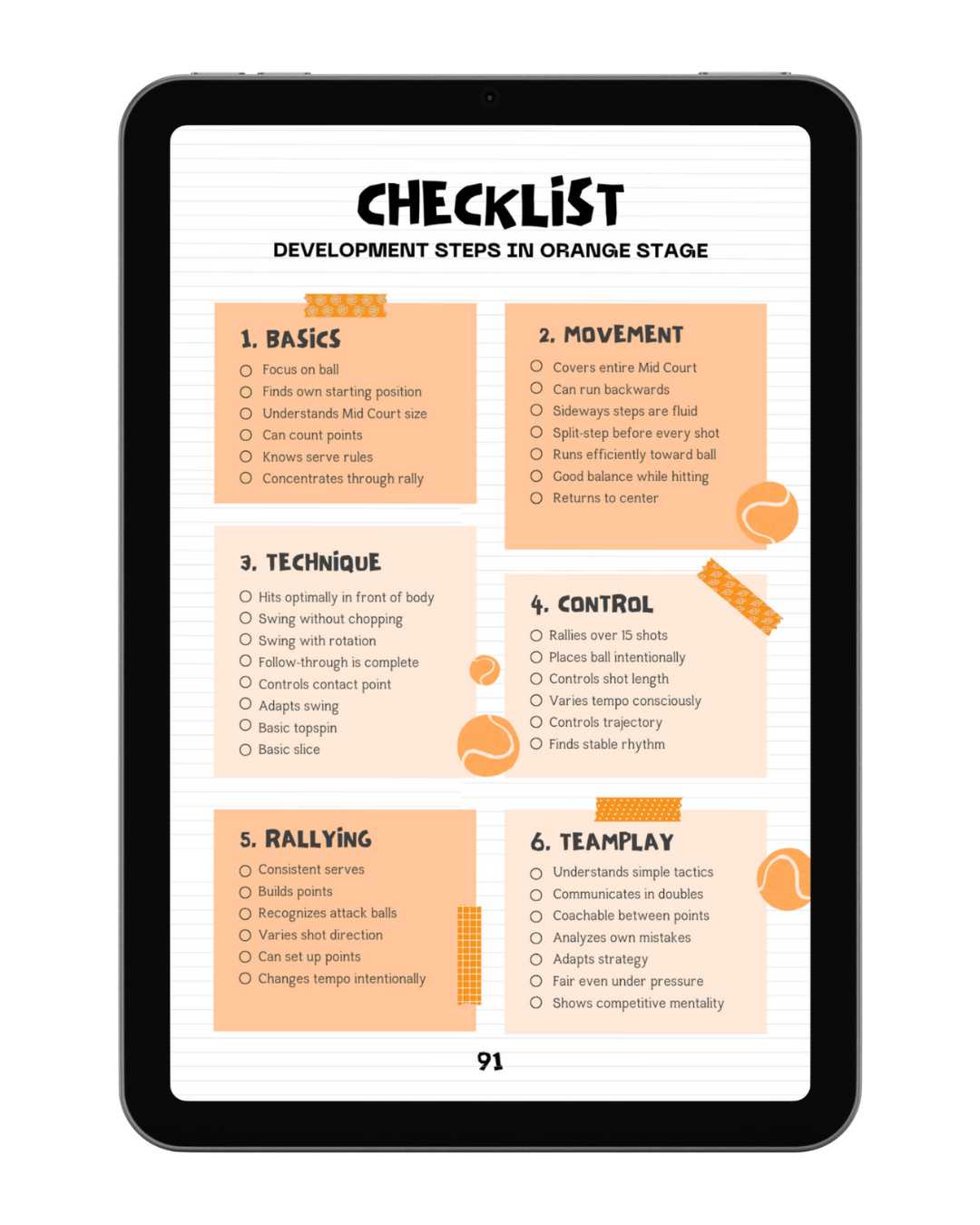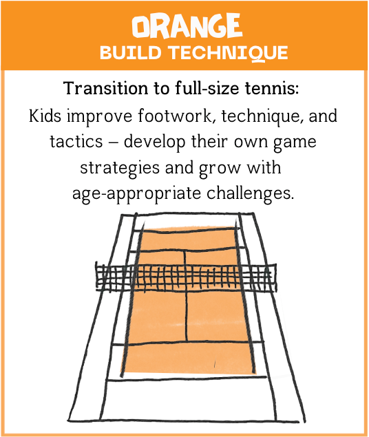 - Orange Stage (7-10 years): Consolidating technique in the midcourt