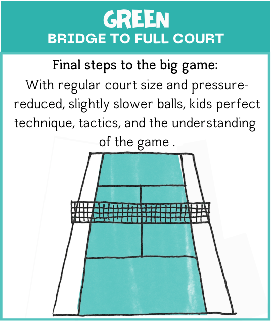 - Green Stage (9-12 years): Transition to full-court tennis